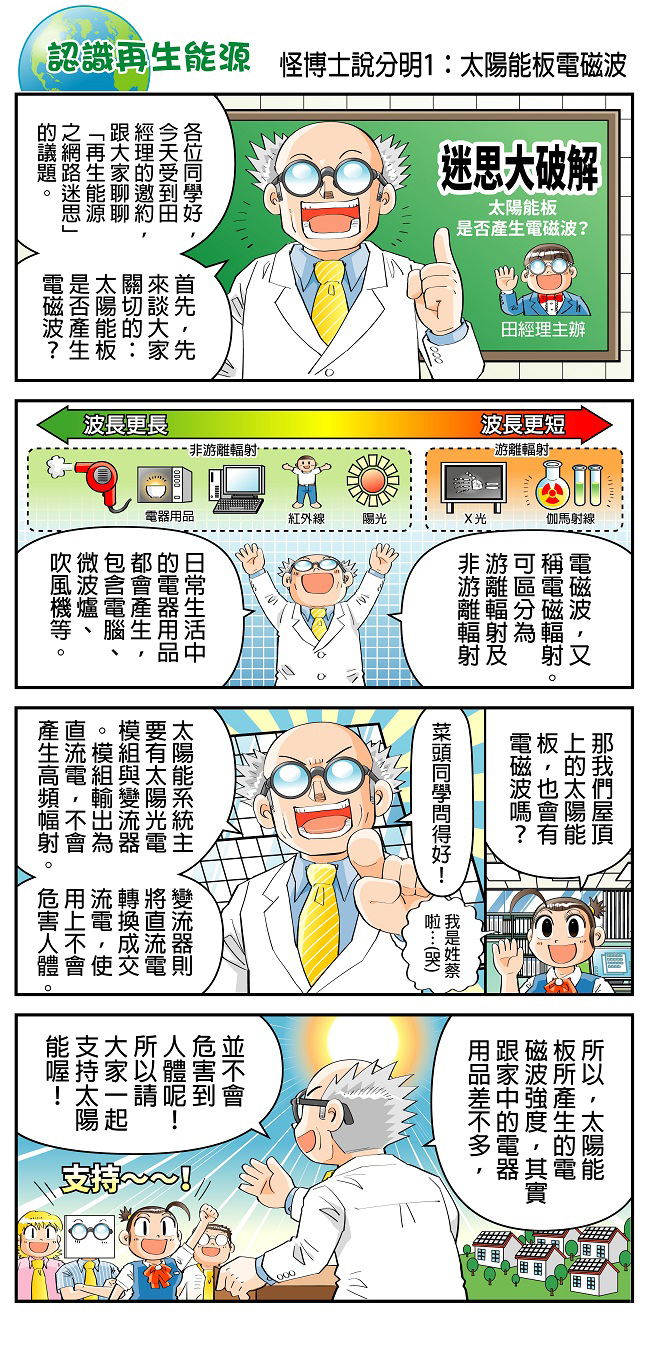 太陽能板吸收太陽能發電的過程中,只會產生非常微量的電流。它所產生的電磁波,約僅相當於一台一般家用電器。而太陽能發電系統安裝在屋頂上更加遠離居民,輻射可說是微乎其微。