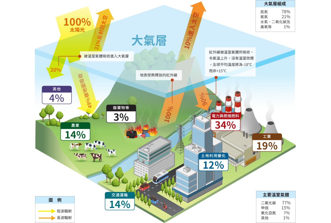 二氧化碳的特性是無色、透光、阻熱。所以太陽光能量以光線型態射進地球時,二氧化碳會透光,因此光線射到地球表面,當地球表面吸收光線產生熱能時,因為二氧化碳會阻熱而無法將熱散到太空中,如:種植蔬果的溫室玻璃讓光線與熱進入溫室,但又把熱保留在溫室內,所以『全球暖化』與『溫室效應』的關係可說是密不可分。 近年來,包括全球變暖和二氧化碳的問題,造成臭氧消耗,加上全球能源資源缺乏等環境問題日趨嚴重。